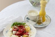 1. Pomidory pokroić na większe kawałki, wyjąć gniazda nasienne. Pomidory przełożyć do szklanego naczynia, dodać połowę listków bazylii delikatnie ugniecionych i porwanych palcami, pół łyżeczki soli i drobno pokrojony czosnek oraz oliwę. Wymieszać i odstawić do lodówki na minimum 15-30 minut.